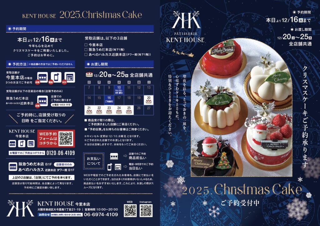 2025 今年のクリスマスもケントハウスで! 2025年10月26日 最終更新日時 : 2025年10月26日 kent-house クリスマスケーキのご予約を受付開始いたしました。 阪急百貨店・京阪百貨店のオンラインストアで、各オンラインストア限定のXmasケーキもご予約を始めております。数量限定の商品もありますので、ご予約はお早めに 詳しくは、各ページでご確認ください! 阪急百貨店オンラインストアへ 京阪百貨店オンラインショッピングへ ケントハウスXmasケーキ予約ページへ